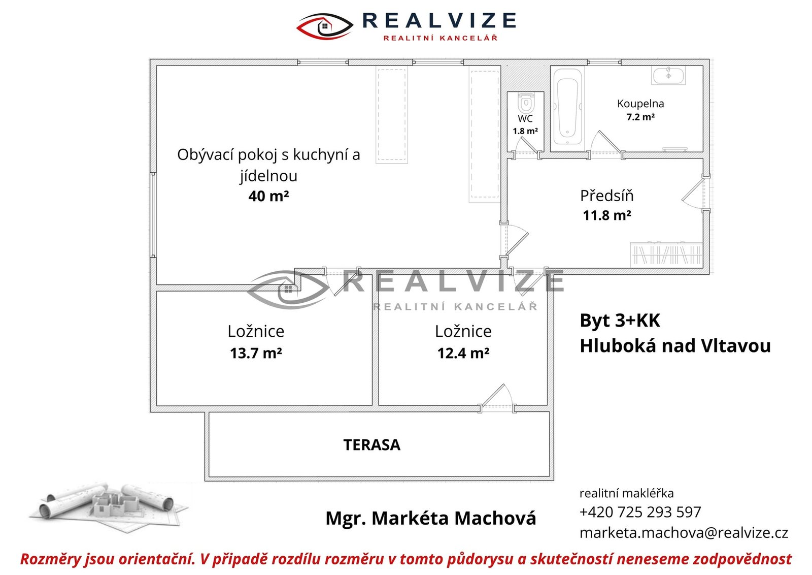 V bytovém komplexu Podzámčí, přímo v samotném centru Hluboké nad Vltavou, nabízíme byt o dispozici 3+kk (83,39 m2) s terasou ( 9,06 m2) a sklepem ( 2,16 m2), který je umístěný ve 4.patře bytového domu s výtahem. Byt nabízí prostornou vstupní halu, obytnou místnost s kuchyňským koutem a 2 ložnice. Z jedné je vstup na terasu. Dále koupelnu a samostatné WC. Pro lepší představu o dispozici bytu je v galerii umístěn půdorys bytu. Bytový dům, umístěný v samotném srdci Hluboké nad Vltavou, nabízí klidné bydlení a zároveň veškerou občanskou vybavenost ( škola, školka, pošta, zdravotní středisko, nákupní zóna).