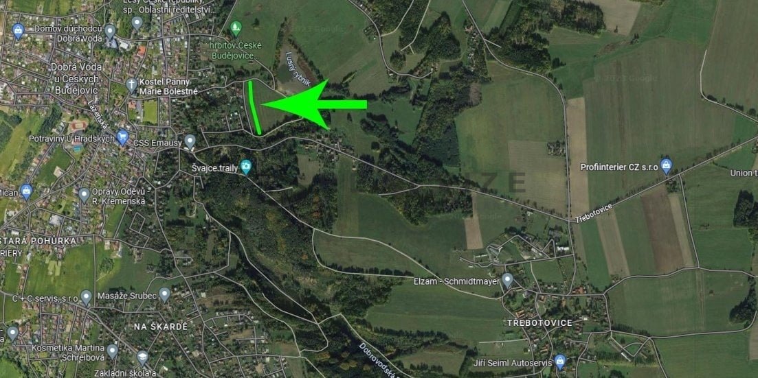 Prodej pozemku o rozloze 8.573 m2 (délka x šířka cca 290m x 30m). Pozemek se nachází v katastru obce Třebotovice, ale na okraji obce Dobrá voda u Českých Budějovic.