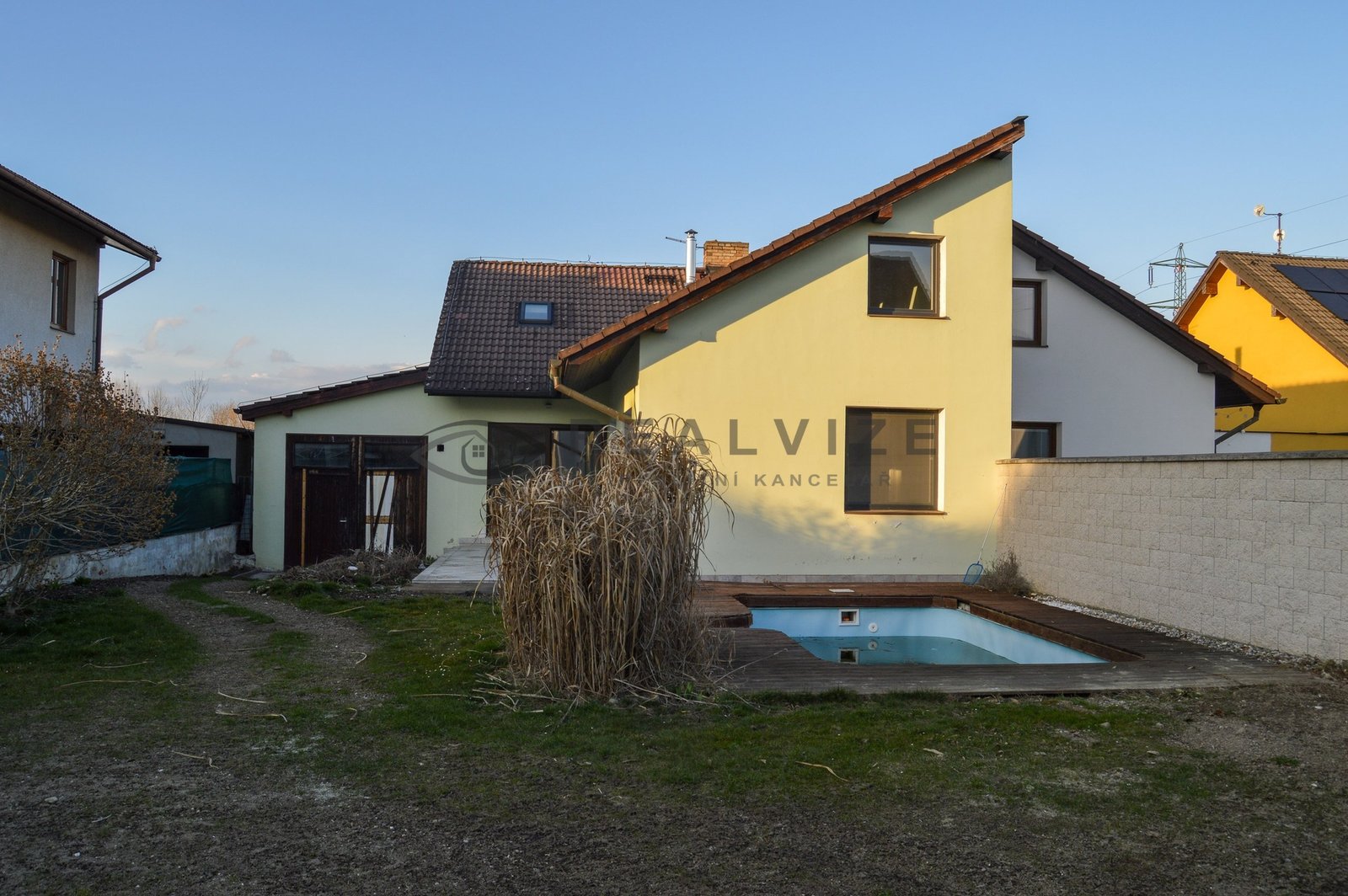 K domu náleží garáž, kterou lze projet z ulice do zahrady, terasa a zapuštěný bazén, ideální pro letní odpočinek.